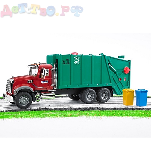 Мусоровоз MACK (зелёный фургон, красная кабина) изготовлен в масштабе 1 к 16. Он функционален, способен имитировать в деталях реальные рабочие процессы, поэтому может быть использован автономно для полноценного игрового процесса. Следует отметить, что другие машинки, спец. техника Брудер из соответствующей серии великолепно дополняют друг друга.